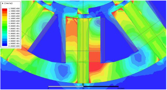 Magnetic saturation leads to nonlinear motor behavior. Magnetic saturation is a characteristic of ferromagnetic materials where each material reaches saturation at different values. Since the force and motor torque of the FSPM are not decoupled any longer if the stator or rotor iron is magnetically saturated, magnetic flux density in FSPM should not exceed 1.5 T. In the simulations for passive stiffness without current through the coils, the risk of saturation is low, but in the simulations for active bearing forces and motor torque, it is necessary to check for iron saturation. Figure 6 shows one part of the FSPM with its magnetic flux density where different colors present the value of magnetic saturation. Red-colored parts are saturated as they feature over 1.5 T of magnetic flux density. The saturation can be avoided in two ways: