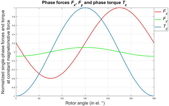 The radial rotor position is achieved by actively stabilized bearing forces. These forces and the motor torque are generated by the stator currents. Due to the used control scheme, bearing forces and motor torque must have a linear dependency on the current; therefore, saturation is not permissible. Additionally, no square force to current dependency should be present [16]. In the FEM simulation for active bearing forces and motor torque, a constant magneto-motive force is fed to one coil, and the rotor angle is varied. As one period of the rotor angle is dependent on the number of rotor poles, the simulated rotor angle is different for certain topologies. The active single-phase bearing forces, and , and the single-phase motor torque feature a sinusoidal shape and are shown in Figure 7.