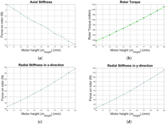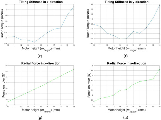 Simulation results for increasing motor height: (a) axial stiffness, (b) rotor torque, (c) radial stiffness in the x-direction, (d) radial stiffness in the y-direction, (e) tilting stiffness in the x-direction, (f) tilting stiffness in the y-direction, (g) radial bearing force in the x-direction and (h) radial bearing force in the y-direction.