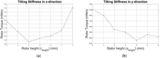 (a) Tilting stiffness in the x-direction with decreasing rotor height; (b) tilting stiffness in the y-direction with increasing stator height.