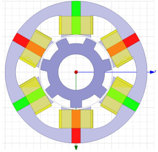 Results show an increase of 52.71% in axial stiffness , as well as 23.75% and 14.87% in tilting stiffness in the x-direction and in the y-direction. The radial stiffness values and were increased, which is unfavorable, but they were compensated with an increase of the active bearing forces (1000 At) and (1000 At). A beneficial increase of 132.02% in motor torque (1000 At) was achieved. Geometric parameters of the FSPM after the optimization with a comparison to the parameters before the optimization are presented in Table 14. Finally, a model of the new FSPM motor is shown in Figure 12.