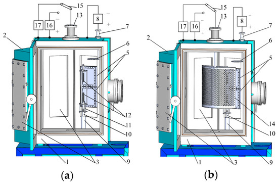 A three-dimensional model of the process vacuum chamber: (a) a view with an open door; (b) a view with an accelerating grid.