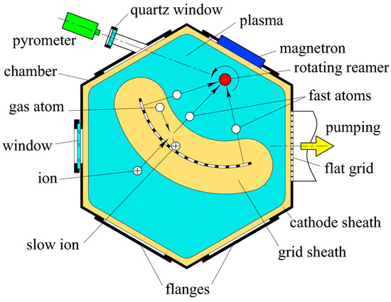 High-voltage feedthrough 13 is mounted at the top of the chamber and 40 cm high titanium grid 14 can be fastened to the feedthrough. The axis of its concave cylindrical surface coincides with the axis of the reamer’s rotation. The radius of the grid surface curvature is equal to 25 cm. The grid can be connected to the negative pole of the DC power supply 16 using switch 15; the DC power supply 16 provides stabilized voltage up to 3 kV at current up to 2 A, or to high-voltage pulse generator 17. The latter allows the application to the grid of high-voltage negative pulses with amplitude 1–10 kV, the width of 10–50 μs, and a repetition rate of 5–50 Hz. A schematic diagram of the vacuum chamber is presented in Figure 3.
