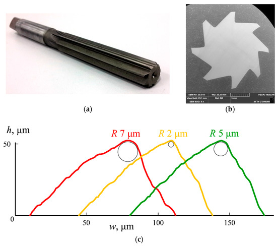 A 16-mm-diameter reamer made of high-speed steel HS6-5-2: (a) a photograph of the reamer; (b) scanning electron microscope (SEM) image (9×) of reamer cross-section; (c) profiles of the reamer cutting edges before processing (on the left), after sharpening and nitriding (in the middle) and after synthesis on the nitrided surface of the 3 μm thick TiN coating (on the right).