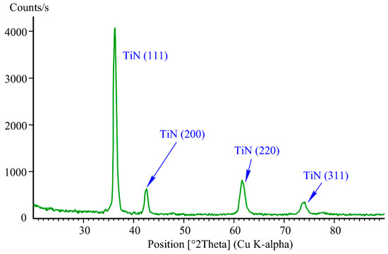 At a stabilized AC current of Im = 15 A in the circuit of magnetrons, stabilized DC current of Ia = 2 A in the anode circuit and 3 kV amplitude of 50 μs, and wide negative pulses applied to the reamers with a repetition rate of 50 Hz on the reamers and the substrate during 2 h, titanium nitride coatings were synthesized. The gold color of the coatings and the X-ray diffractogram for the coating deposited on the substrate (Figure 6) show that the coatings contain only one phase of TiN.