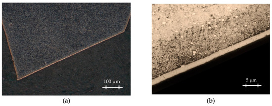 Optical images of a high-speed steel reamer after combined surface strengthening: (a) a general view of a reamer tooth; (b) microstructure of the surface layer of the reamer tooth.