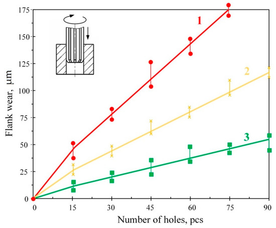 The dependence of wear on the back surface with different surface treatment on the number of machined holes in the blanks made of 41Cr4 steel: (1) uncoated; (2) TiN coated; (3) after combined surface strengthening.