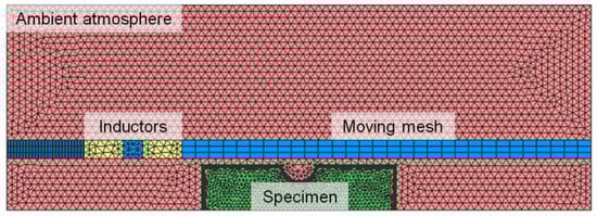 where f is the frequency of the electric current and κ is the electrical conductivity depending on the temperature-dependent electric resistance ρ(T) of the base material. In accordance to the real inductive heating process, two separate coil inductors exhibiting different current frequencies were modeled. The first coil featured a medium frequency to ensure global heating and the second coil manifested a high frequency. Thus, the electromagnetic skin depth δ was significantly reduced in respect to the higher frequency to intensify local heating in the surface layer of the specimen, as seen in Equation (3). As the coils were moving along the axis of the specimen, a moving mesh needed to be designed along this path. The ambient atmosphere was defined as air at room temperature, which was also meshed to incorporate heat loss by convection and radiation during inductive heating.
