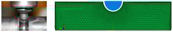 The third part of the manufacturing process simulation was the superimposed mechanical StrP process. Therefore, the resulting local material data by IH was transferred from Sysweld® to Abaqus®, in order to perform the mechanical simulation. The numerical model was set up in agreement to the experimental investigations [] incorporating a pin, which iteratively impacted the surface at the notched area of the specimen, as seen in Figure 3. The radius of the pin was comparable to the radius of the notch. The experimental results in [] highlighted that the superimposed StrP process did not majorly affect the local microstructure and hardness condition. Nevertheless, the subsequent StrP post-treatment did significantly change the residual stress state in depth, which was also the aim of the numerical analysis of the StrP simulation within this work.