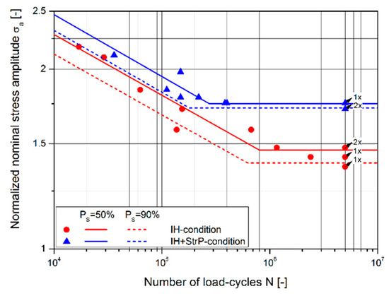 Comparison of the fatigue test results (evaluated at PS = 50%) for base material (BM), IH, and IH+StrP-condition [].