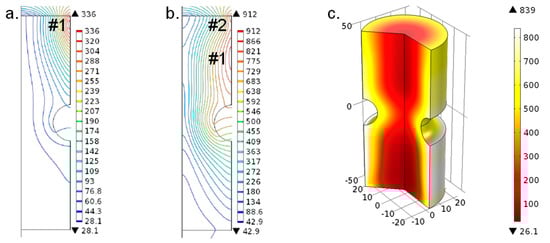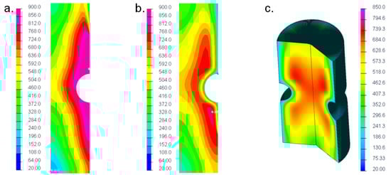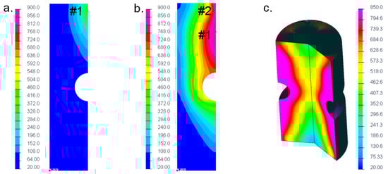 After transferring the time-dependent temperature data for each node of the model from Comsol® to Sysweld®, as an initial step, the heating process was computed in Sysweld®. The results are shown Figure 6. At first, Figure 6a displays the increment at which induction coil #1 started at the top end of the specimen. It was observed that a similar peak temperature of about 330 °C occurred at this time step. Further on, Figure 6b presents the time increment at which coil #2 began, where again a similar maximum temperature of around 900 °C was computed. The final condition after finishing the heating process is depicted in Figure 6c revealing a peak temperature of about 850 °C, which was in sound accordance to the previous simulation in Comsol®. To sum up, the numerically computed temperature distribution in Sysweld® was similar to the simulation results given by Comsol®, which validated the applicability of the self-written interface.
