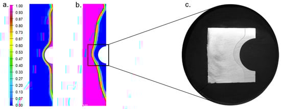 Numerically computed amount of the martensitic (a) as well as ferritic/pearlitic phase (b) and comparison of induction hardening depth of a real specimen (c) (based on [,]).