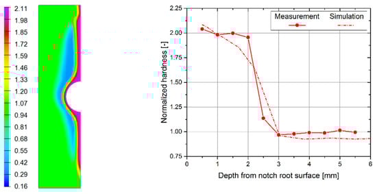A comparison of the numerically evaluated and measured Vicker’s hardness is presented in Figure 9. Therein, the values were normalized by the measured hardness of the BM. It is shown that both measurement and numerical simulation agreed well, whereby an increase of a factor of two in hardness was gained within the surface layer, due to the IH process. The effect of IH was observed up to a depth of roughly 3 mm beneath the surface at the notch root, which fit well to the numerical and experimental evaluation in Figure 8.