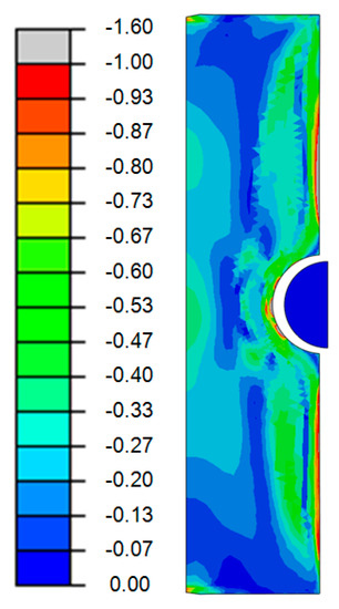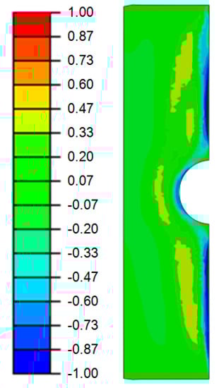 During the mechanical post-treatment, it was observed that there occured comparably high compressive stress peaks below a normalized value of −1.00 within the contact area at the notch root, as seen in the black region in Figure 11b. Due to this stress state, the IH surface layer, as well as the subjacent core material, was additionally post-treated, which influenced the local residual stress state in depth. As shown by X-ray residual stress measurements in [], not only the axial but also the residual stresses in tangential direction were significantly affected by the superimposed StrP process. To cover this multiaxial residual stress state, the von Mises equivalent stress was evaluated. The final von Mises residual stress condition after the superimposed StrP is depicted in Figure 12.