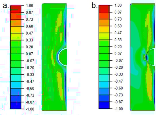 After transferring the IH process-dependent local material, as well as residual stress data from Sysweld® to Abaqus®, the superimposed StrP process as mechanical post-treatment was simulated. The axial stress results before, see Figure 11a, and during the peak compressive load, see Figure 11b, are shown as follows.