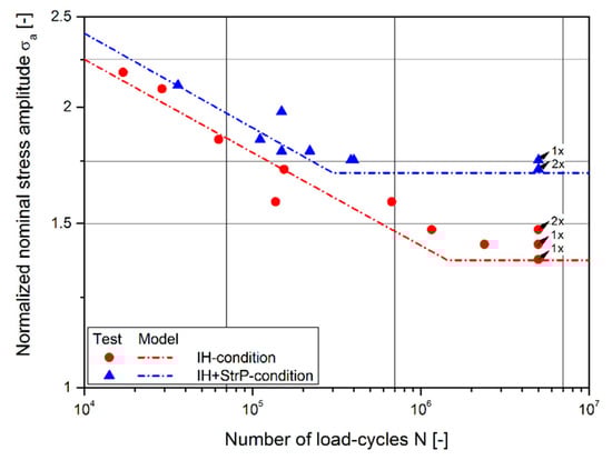To evaluate the fatigue behavior of the researched specimens, fatigue tests under a load stress ratio of R = −1 were conducted. Figure 4 depicts the results for the IH and the IH + StrP − condition. The results were normalized with the statistically evaluated nominal fatigue strength amplitude for the base material (BM), at a number of 5e6 load-cycles and a survival probability of PS = 50%. It was shown that IH elevated the mean fatigue resistance at 5e6 load-cycles by a factor of 1.46, and IH + StrP by a factor of 1.75 compared to the BM. These results proved the beneficial effect of the post-treatment processes and the experimental values acted as basis to validate the numerical fatigue analysis. Further details of the fatigue test procedure, statistical evaluation of the fatigue data, as well as extensive fracture surface analysis, is provided in [].