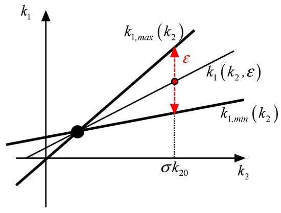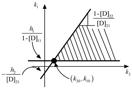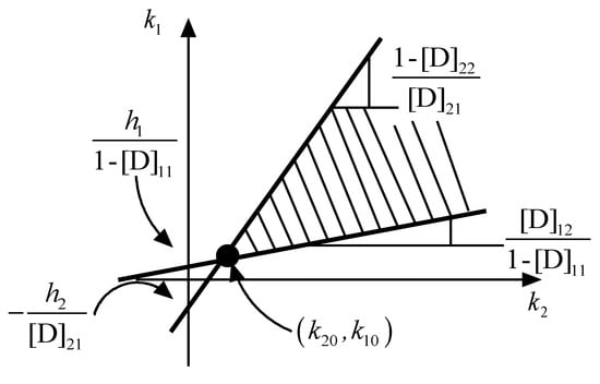 The solution of Equation (33) can be graphically obtained, as depicted in Figure 1, where one can observe that, in order to satisfy the sliding conditions, and can be deliberately chosen within the dashed area. One usually lets the first inequality of Equation (22) degenerate into an equation, hence the solution is given by the “cone vertex”, i.e., the point (, ). This solution area allows one to choose the appropriate values for and (within certain boundaries) in order to obtain the desired performance from the system. In addition, and can be “moved” inside the cone depending on the state measurement, further improving the controller performance.