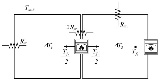Where and are the relative temperatures of the kilns with respect to ambient temperature in K, is the interior kiln thermal resistance in m2K/W while and are the thermal flows generated by the two heat sources in W. The behavior of the system can be simply described as follows: