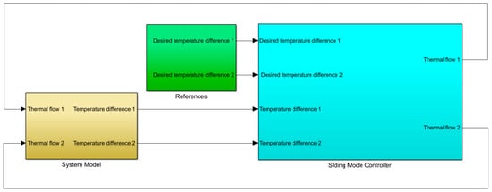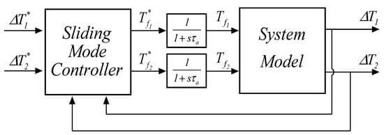 According to the theory shown in Section 2, one can proceed to design the SM controller. The control objectives are the two relative temperatures, and , corresponding to the state variables of the system. Therefore, the sliding variables can be defined as: