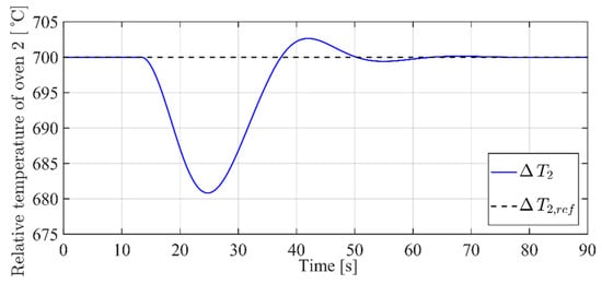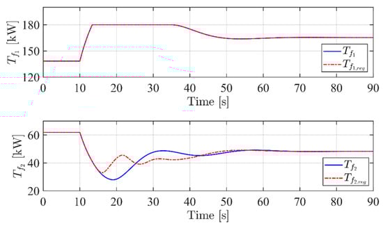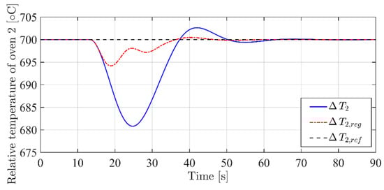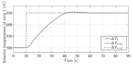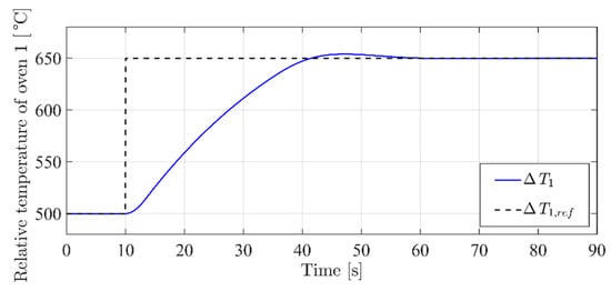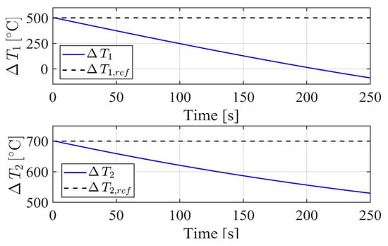 The simulation, as shown in Figure 6, considers a step variation in the reference 10 s after the simulation start, from an initial condition of 500 °C to a steady state working point at 650 °C, while reference is kept constant at 700 °C. Please remember that in this first set of simulations, and .