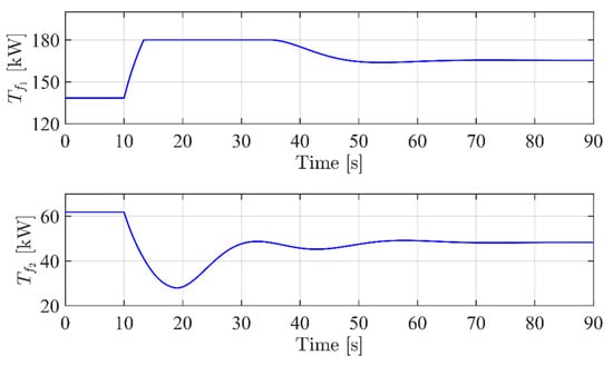 The simulation results show the correct operation of the SM controller, which is able to take the controlled variables as their references. However, from Figure 7, one can notice a non-negligible dip in the profile during the transient. Figure 8 shows the time profiles of the two thermal flows coming from the two actuators.