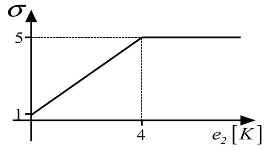 As one can intuitively understand, an increase or decrease of involves a greater or smaller “strength” of the ith channel. As a consequence, in order to pursue the aforementioned goal, it is necessary to make the 2nd channel of the system “stronger” than the 1st. Therefore, during the transient, must be kept at its minimum value, while has to be dynamically increased within the dashed area in Figure 10. This means that regulation parameter ε must be zero value throughout the transient (which implies that ), while is defined on the basis of the tracking error of such that, if increases, must also increase accordingly, e.g., the functional relation depicted in Figure 11.