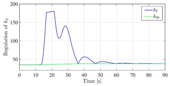 The results of this second simulation set clearly point out the performance improvement obtained thanks to the tuning method proposed. Indeed, with an almost identical behavior of the variable (Figure 12), one can notice in Figure 13 how the regulation leads to a much better profile for , which does not deviate more than 5 °C from the constant reference.