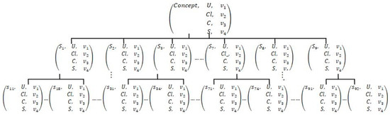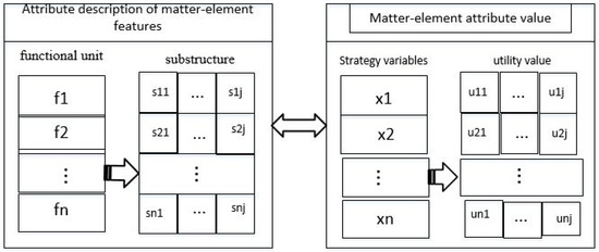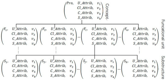 where the information of the entire product concept is denoted by the matter-element model, for example, the specific information of the ith functional unit of the product, which includes structural information S_Attrib, constraint information C_Attrib, utility information U_Attrib, and hierarchical information Cl_Attrib, is denoted by the second-level matter element. The substructures to achieve a functional unit are denoted by third-level matter elements. It should be noted that the third-substructure-layer matter elements are alternative substructures, which are optional strategies of the game player, since the effectiveness of structural combinations has not been judged; therefore, no constraint information is required.