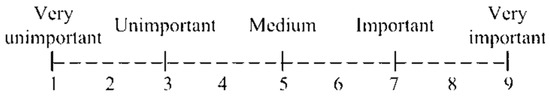 where uij is a utility vector of a jth substructure of an ith functional unit provided by experts and designers based on a nine-point scale [22], which denotes the utility index of sij; xi is the strategy variable of functional unit fi, which denotes the choice information of alternative substructures. In the matter-element model proposed above, xi is the value of S_Attrib for a game player. The frequently used nine-point scale is shown in Figure 4.