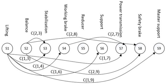 Wi denotes the importance of functional unit i in the whole product concept, where , and as for nine functional units of the hoist, ① lifting, ② balance, ③ stabilization, ④ working brake, ⑤ reducer, ⑥ support, ⑦ power transmission, ⑧ safety brake, and ⑨ master support, importance vector Wi = (0.17, 0.11, 0.11, 0.10, 0.13, 0.09, 0.13, 0.07, 0.09) was obtained based on knowledge.