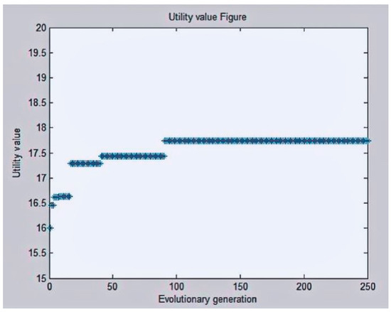 In order to solve the above model with the EGA, the functional units were mapped to the game players; the substructures were mapped to the strategy set for the player; and the constraints condition was mapped to the game rules. Perturbation probability pi of each functional unit was given according to the importance degree of the functional units for the entire hoist design, where pi = (0. 781, 0.547, 0.452, 0.343, 0.433, 0.536, 0.412, 0.246, 0.435), and maximum evolution generation T = 250 was set according to multiple experiment simulations, as shown in Figure 9.