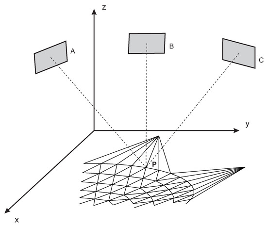 As depicted in Figure 2, photogrammetry is based exclusively on angle measurements: Three-dimensional co-ordinates are calculated by an optical triangulation (or intersection) of two or more images taken from different positions. The object to be measured is identified by targets mounted on it, usually made of reflective material to produce a high contrast between the target and the background [2]. Typically, a calibrated scale bar is integrated into the object, in order to reproduce it in true scale. At the end of the measurements, a dedicated software calculates the 3D co-ordinates in the chosen Cartesian co-ordinate system (x, y, z).