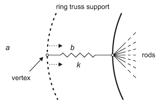 The elastodynamic model of the flexible ring truss support can be found using analytic techniques combined with matrix structural analysis [54,55,56,57], elliptic integrals [58,59], FEM models [60,61,62], and flexible multibody formulations [63].