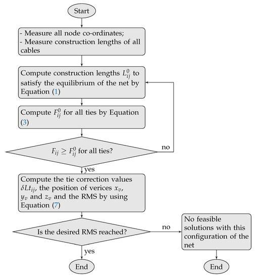 Tie-cable regulation is usually independent of the actuators used for the LDA deployment [38,39,40] and from the control system [41,42,43,44]. Here, the method to regulate tie cable tension in an antenna with rigid ring truss support is first described. Once the deployment has been carried out and all node co-ordinates of the net have been measured, the reflective surface will typically deviate from the design configuration due to mechanical errors. As a consequence of this deviation, the system of equilibrium equation is not satisfied for the current configuration. Then, denoting with , , , and the Young modulus, the cross-section area, the measured length, and the construction length of cable , respectively, and with , , and the spring constant, the measured length, and the construction length of tie , respectively, the system of nonlinear equations for each free node i, with j adjacent nodes, is not satisfied: