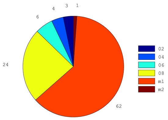 Pie chart of the error (absolute value), grouped by measuring ranges (mm), between the measured construction lengths and those obtained by solving for equilibrium in System (1).