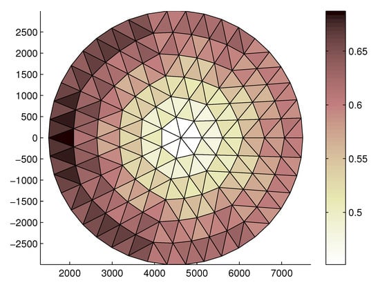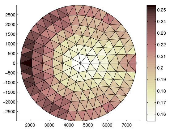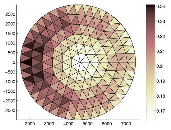 In Figure 9 the local faceting error for the chosen initial configuration is shown. The local faceting error is calculated by considering the centroid of the triangular facets into which the surface can be decomposed [64,65,66,67]. As can be observed, the faceting error follows the shape of the asymmetric reflector since the chosen error is proportional to the tie lengths. As a matter of fact, the central zone is the one with the shortest cables and, therefore, with the lowest faceting error. On the contrary, the tie lengths, and consequently the errors, grow; moving from the centre to the outer perimeter of the net.