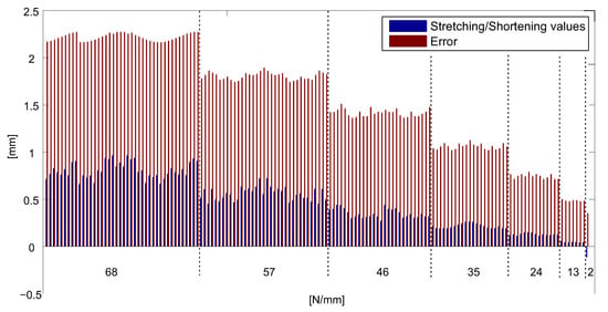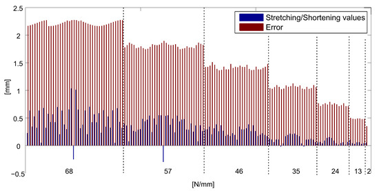 The value of the spring constant for tie cables ranges from N/m to N/m, with a radial step of N/m starting from the centre (central node) to the outer ring cables. The initial RMS error on the front net was simulated by introducing an additional value to each node proportionally to the length of the tie connected to it. By imposing the equilibrium in System (1), we can determine the construction lengths described in Section 2. Nevertheless, from Figure 8 it can be noted that the maximum error obtained was about 1 mm, representing only 1% of the total cables; the largest percentage (86%) showed an error between 0.6 mm and 1 mm.