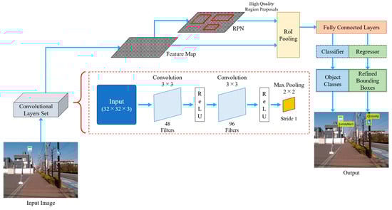 The structure of CNN used in our Faster R-CNN is also shown in Figure 2. As mentioned earlier in this subsection, the set of convolutional layers of the CNN analyzes the whole input image to construct a convolutional feature map. As the size of the smallest landmarks in the utilized dataset is nearly 32 × 32 pixels, the input size is set to 32 × 32 × 3, where the last 3 is for three color channels: red, green and blue. The set of convolutional layers contains two, two-dimensional convolutional layers, with a rectified linear unit (ReLU) attached after each convolutional layer. The set also includes one max pooling layer for down-sampling purposes. Each convolutional layer employs a 3 × 3 filter and has the stride settings of 1 pixel for both horizontal and vertical strides. The number of filters in the first convolutional layer is 48, while 96 filters are used for the second convolutional layer. The max pooling layer is placed at the end of the layers set, in which the pooling size is 2 × 2 and the stride settings is 1 pixel for both horizontal and vertical strides. This small pooling size is applied to prevent premature down-sampling of the input image, which may cause the loss of features in the result feature map.