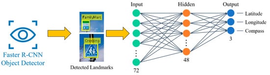 The implemented FFNN consists of 72 input neurons, 48 hidden neurons and three output neurons, as shown in Figure 3. The 72 inputs are slots of bounding box elements of detected landmarks. Each bounding box contains four elements for positions and sizes of the box. We have limited the number of landmark classes to nine due the number of landmark classes in the experiments. Further details of nine landmark classes will be given in Section 3. Each class has the limitation of maximum of two detection instances. For example, if there are three ‘Crossing’ landmarks detected, two instances with the highest objectness scores will be used for localization. This results in the total of 72 (9 × 2 × 4) input neurons. Default value of input neurons is zero if there is no detected instance for each slot of landmarks. The three output neurons correspond to latitude, longitude and compass. The number of hidden neurons, however, are acquired from trial-and-error tests. Activation function of FFNN neurons is the symmetric saturating linear transfer function.