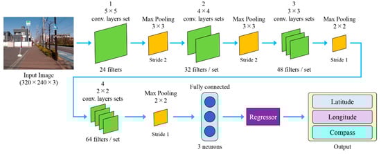 Design of the implemented CNN is shown in Figure 4. The best architecture is determined by trial-and-error method and the combination from different CNN examples and principles available [24]. The CNN for localization comprises 37 layers in total. The input layer of the CNN has the size of 320 × 240 × 3 (320 pixels width, 240 pixels height and three color channels: red, green and blue). There are 10 sets of convolutional layers, batch normalization and ReLU included within 37 layers of the CNN, where convolutional layer, batch normalization and ReLU are displayed together as one green layer in the diagram. There are different sizes and different amounts of filters among the implemented convolutional layers. The earliest convolutional layer employs the largest filter size of 5 × 5, while the filter size is decreasing as the network continues deeper, to the last convolutional layers which apply the filter size of 2 × 2. On the contrary, the number of filters begins with a small number of 24 filters in the first convolutional layer. The number of filters in each convolutional layer set increases as the network progresses deeper, to the amount of 64 filters in last layers. We employ four max pooling layers at the size of 3 × 3, 3 × 3, 2 × 2, and 2 × 2, with the stride settings as 2, 2, 1, and 1 respectively. Final parts of the CNN for localization consist of a fully connected layer and the regressor. Since the localization is determined based on latitude, longitude, and compass orientation, only three neurons are employed in the fully connected layer of the CNN.