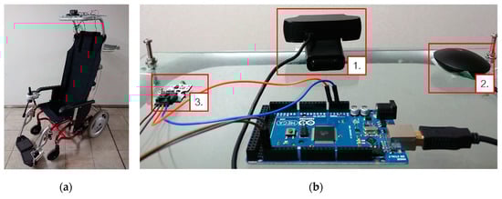 Wheelchair robot equipped with sensors for data gathering: (a) overall view of the wheelchair robot; (b) sensors for data gathering: 1. Camera, 2. Global Positioning Systems (GPS) receiver, and 3. Compass sensor.