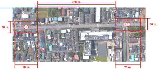 Geotagged images in the dataset were taken by a wheelchair robot equipped with camera, GPS receiver and compass sensor (Figure 5). The wheelchair robot is 55 cm in width, 120 cm in length and 140 cm in height. Sensors for data gathering were attached above the seat. We used a Logitech C920 HD (Logitech, Lausanne, Switzerland) as the robot camera, BU-353S4 (GlobalSat, Taipei, Taiwan ) as the GPS receiver and an Octopus 3-axis digital compass sensor. All images in the dataset were taken from the area near Koganei campus of Hosei University, Japan. Two areas were selected for robot localization in outdoor environments, as shown in Figure 6. The length and width of area 1 is 70 and 30 m, respectively. Area 2 is 75 m in length and 30 m wide. The two areas for experiments were in a distance of 250 m from each other. There are different types of landmarks available in each area, which distinguished one experimental area from the another.