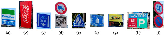 Landmarks used in the experiments: (a) ‘FamilyMart’; (b) ‘CocaCola’; (c) ‘BicycleLane’; (d) ‘NoTruck’; (e) ‘Crossing’; (f) ‘Lawson’; (g) ‘TimesParking’; (h) ‘LawsonParking’; (i) ‘RoadSign 1’.