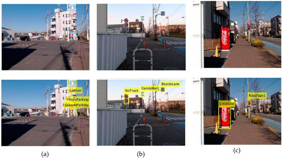 All gathered images in the dataset were hand-labeled with bounding boxes of landmarks in images. Nine types of landmarks were utilized for robot localization: ‘FamilyMart’, ‘CocaCola’, ‘BicycleLane’, ‘NoTruck’, ‘Crossing’, ‘Lawson’, ‘TimesParking’, ‘LawsonParking’, and ‘RoadSign 1’. Figure 7 shows pictures of these nine landmarks in the area of experiments. Each bounding box is in the form of a vector with four member elements, which contains horizontal and vertical position coordinates of the top-left corner, width, and height of the bounding box in the image. Unit of position coordinates, width, and height of the bounding box is determined by the number of pixels. Horizontal and vertical position coordinates are referenced from top-left corner of the image. For example, a bounding box that has a vector of {10, 20, 56, 72} has its top-left corner at the pixel number 10 horizontally and 20 vertically, and the width and height of the box are 56 and 72 pixels, respectively.