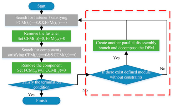Unlike static DPM that does not change during the disassembly process, the DPM proposed by the authors is dynamic. In fact, it is modified every time a component or fastener is removed. When an element is removed, the corresponding row and the corresponding column are deleted, thus passing from a matrix that contains (m × n) elements to one that contains ((m − 1) × (n − 1)), indicating with m the number of rows and with n the number of columns. Furthermore, in disassembling any modules, considered as subassemblies, the DPM is divided into two or more sub-DPMs, each representing a new branch for disassembling. This dynamic system helps to reduce the size of the DPM and reduces the difficulty in finding feasible solutions.