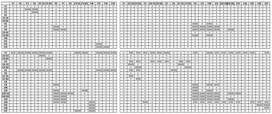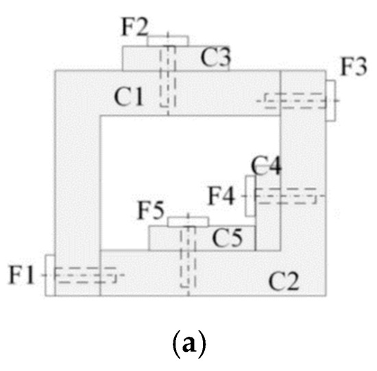 In CFM, for example, it can be seen that C1 is blocked by F1 in the −x direction, while in FCM, it is noted that F5 is blocked by C1 in the +y direction. Moreover, in the CCM, we can see that C3 is in the direction of removal +y of C5, while from the CCM, we deduce that there are no constraints between the fasteners because there are only 0.