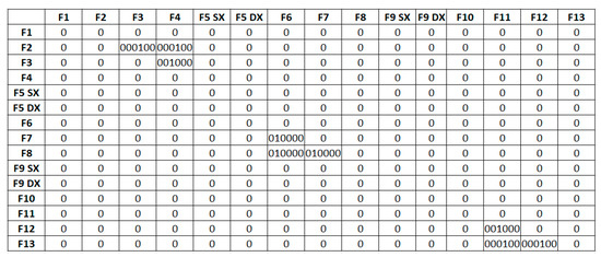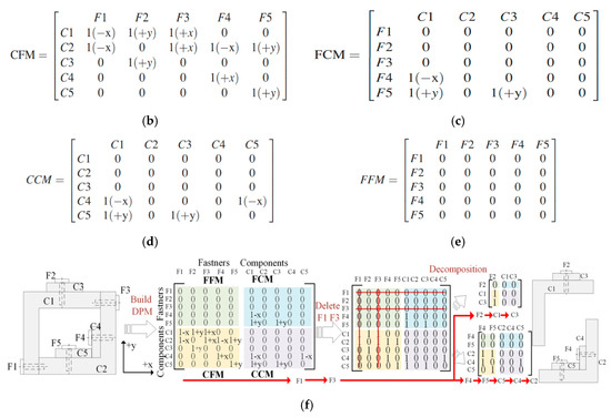 At this point, the DPM can be created by “joining” the four matrices previously obtained. It is therefore decided to try to remove the fasteners in the following order: F1, F3, F2, F4, and F5.