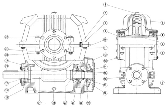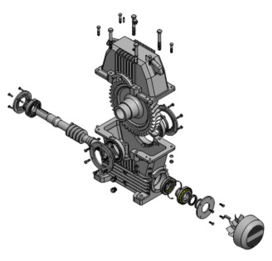 The gearbox represented is the RV 250 screw gearbox of the Rossi Motoriduttori Soc. of Modena (Figure 6). Starting from the assembly (represented in 2D), we obtained the bill of materials (BOM), and then we made every single component in 3D, finally obtaining the gearbox in question by assembling the various components and inserting the properties and the relative constraints between them.