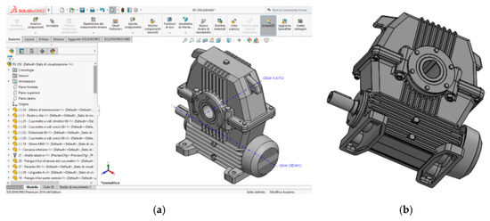 For the 3D representation of the gearbox, it was decided to use a 3D CAD Modeler, i.e., Solidworks (version 2016), which is a CAD software (computer aided design) developed by Dassault Systèmes, used to draw and for three-dimensional design parametrics. We selected Solidworks because it is a program created specifically for mechanical engineering, and its use is quite intuitive. Moreover, it is possible to find various sources of information on the Internet (for example, forums and video tutorials) that allow easily acquiring greater knowledge about the software.