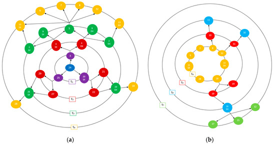 In this case, the C6 component has four possible ways in which it can be removed: Up, down, right or left. The first disassembly wave at the instant t1 hits the components C2 and C3 at the top, C7 at the right, C14, C13, and C12 at the bottom, and C5 at the left. C6 can be considered 1-dependent with respect to C5 or C7, whereas it is considered d-dependent with respect to the other components. To remove the C5 and C7 components, it is necessary to also remove C4 and C8 (components that are involved by a second disassembly wave at the instant t2) (Figure 3b,c).